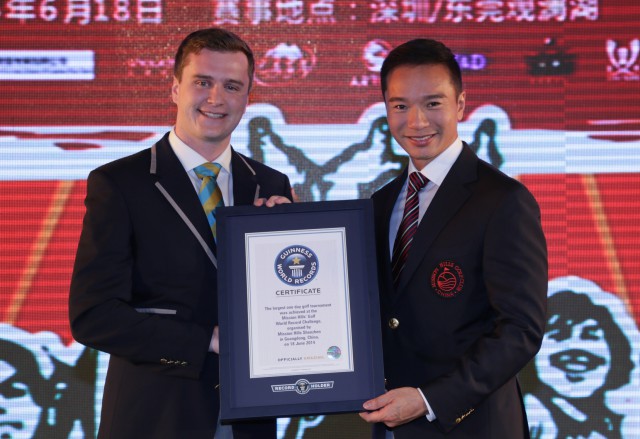 Mission Hills’ Tenniel Chu (right) receives the world record confirmation certificate from Charles Wharton. Picture by Miao Hua/Mission Hills